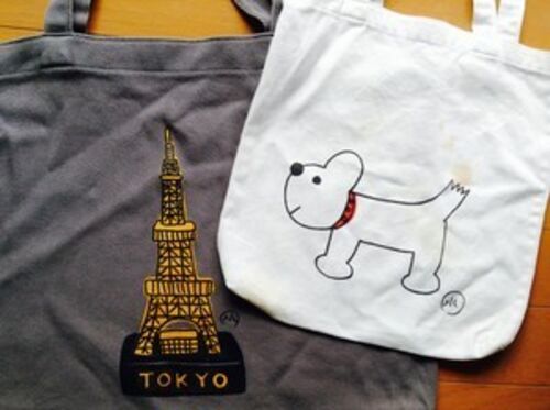 くだんの「水丸グッズ」続き : これはぼくの娘が愛用の水丸印トートバッグ。娘は小学生の頃から、この水丸おじちゃんの犬バッグが大好きで、やはり今でも現役で使っているそうです。もうひとつの、東京タワーの〈みやげ物〉というモチーフも水丸さんのオハコ…